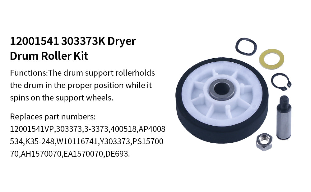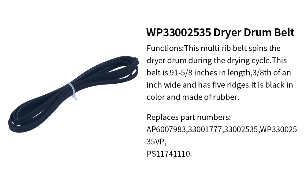 1. Including: 2pcs 12001541 303373K Dryer Drum Roller Kit, 1pc 6-3700340 Dryer Idler Pulley, 2pcs 306508 Dryer Tumbler Bearing Kit, 1pc WP33002535 Dryer Drum Belt (length: 91-5/8 inches, width: 3/8 inch, five ridges)