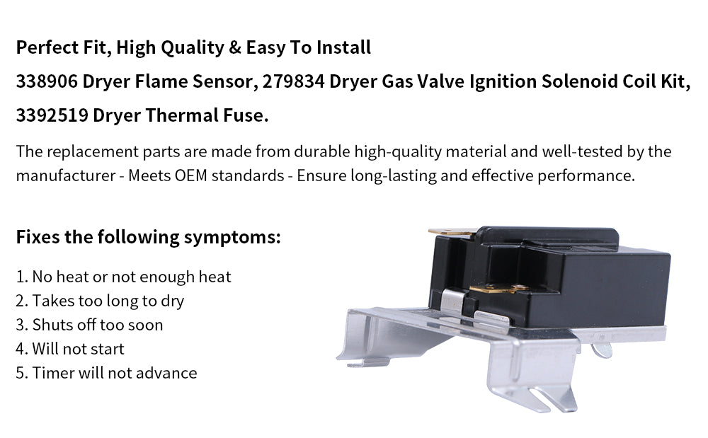 2.What it is: The 338906 gas dryer flame sensor monitors whether the igniter is hot enough to ignite the gas to ignite the burner. 279834 dryer coil kit for gas valve. Includes two new gas coils. One coil is the main coil and one is the safety coil. If a coil stops working, it should be replaced in pairs.3392519 dryer non resettable thermal fuse, two 3/16" wire terminals.