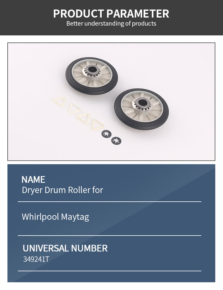 1.PARTS NUMBER: - 349241T Rear Drum Support Roller Kit. Replaces part numbers PS347627, 8170, 8205, 337089, 340352, 349241, 661562, 3389901, 3397588, 3397590, 99989678, 99989679, 26000349241, 3436, AP3098345, PS347627, EAP347627.