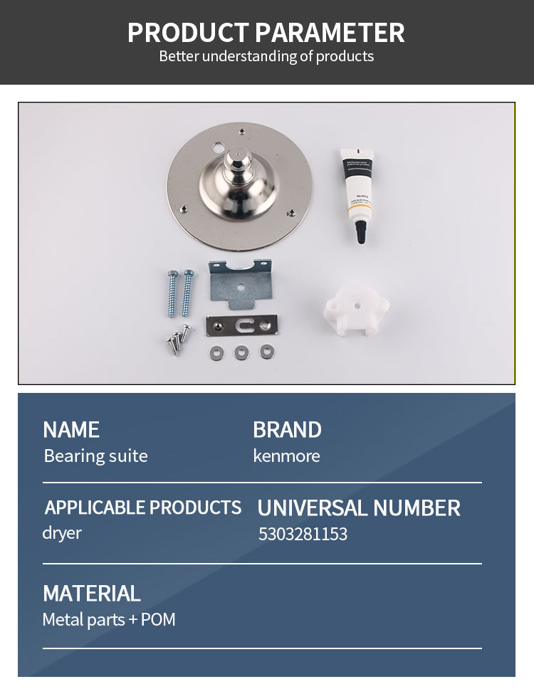 1.Model number: 5303281153 Frigidaire Dryer Parts Frigidaire Dryer Rear Drum Bearing Kit (one bearing, one ball shaft, one ball bearing, one ball bearing retainer, a small tube of high temperature lubricant and installation screws).