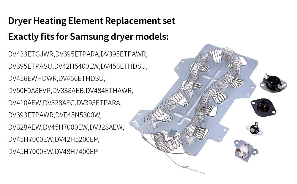 2. Exactly fit for Samsung dryer models: DV433ETGJWR, DV395ETPARA, DV395ETPAWR, DV395ETPASU, DV42H5400EW, DV456ETHDSU, DV456EWHDWR, DV456ETHDSU, DV50F9A8EVP, DV338AEB, DV484ETHAWR, DV410AEW, DV328AEG, DV393ETPARA, DV393ETPAWR, DVE45N5300W, DV328AEW, DV45H7000EW, DV328AEW, DV45H7000EW, DV42H5200EP, DV45H7000EW, DV48H7400EP.