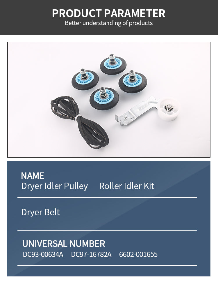 2.Package include: 4 x DC97-16782A upgraded dryer drum rollers, 1 x DC93-00634A upgraded idler pulley (1pc x screw), 1 x 6602-001655 upgraded dryer belt , 1xDC61-01215B. Superior quality, Save money while having the fun of doing it yourself