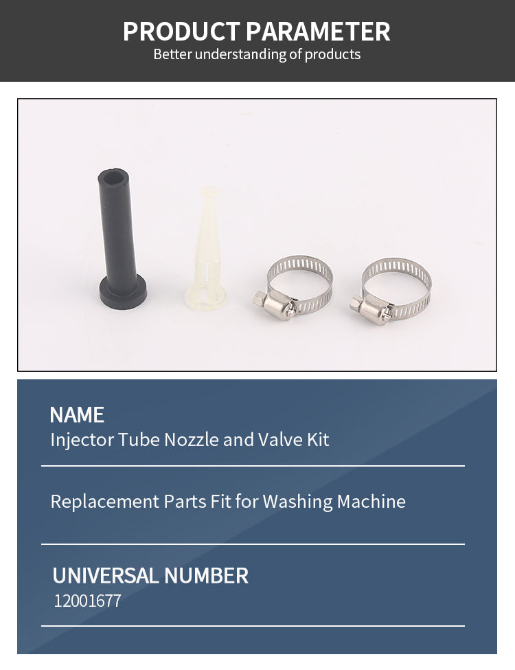 1.Injector Valve Nozzle Kit Includes:12001677 Washing Machine Injector Tube Nozzle and Valve Kit, Contains nozzle (213015), injector (216201) & two clamps.