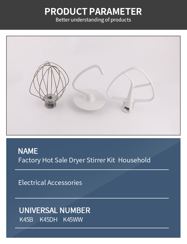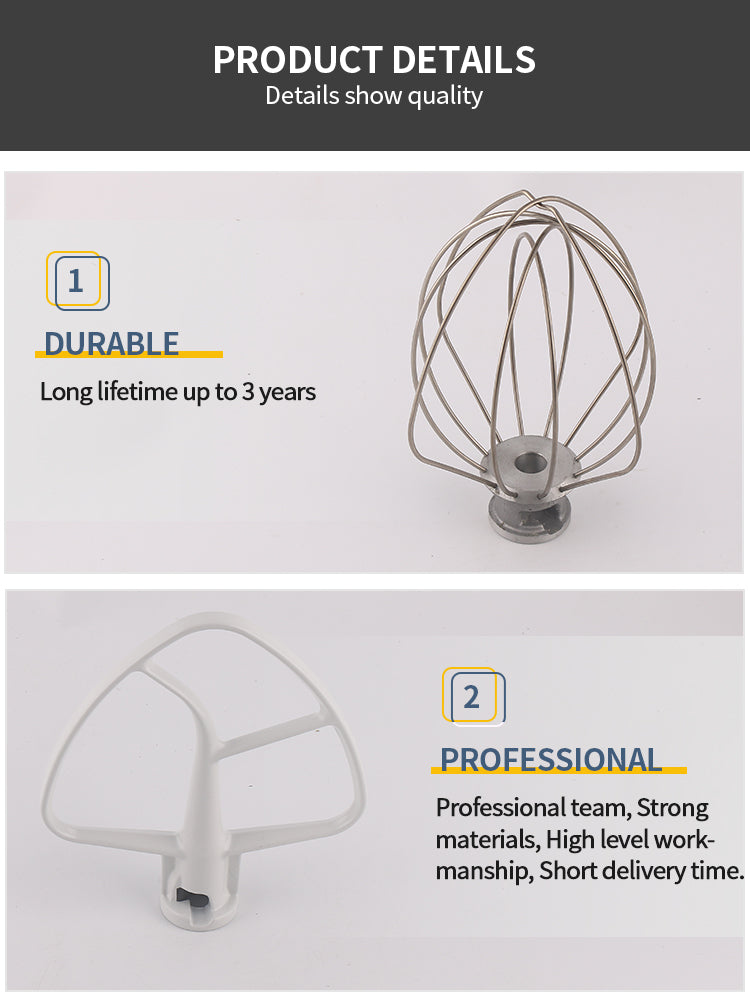 1.Package include:Mixers kitchen aid attachments: 1 x K45DH dough hook, 1 x K45WW wire whip, 1 x K45B coated flat beater, 3 piece set of stand mixers,These replacement parts are made of aluminum, stainless steel, manufacturer tested anti-stick nylon coating for long life, not OEM parts, but better quality to OEM requirements