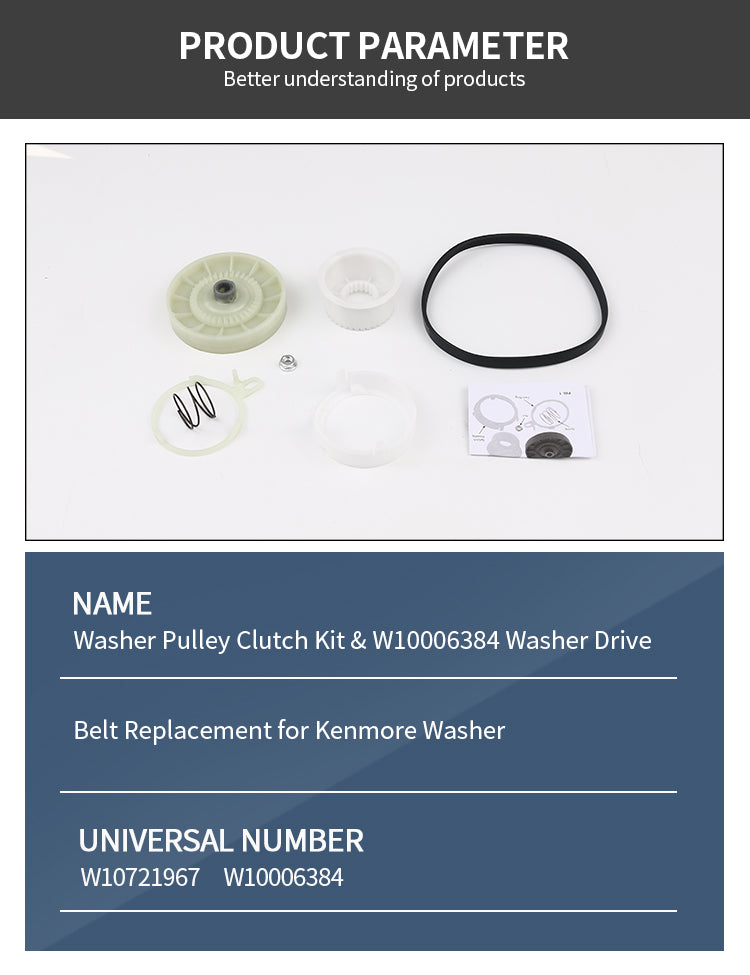 2.Product Function:W10721967 Washer Pulley Clutch Kit & W10006384 Washer Drive Belt replaces part AP4514411, AP5951296, AP6014712, W10536113, W10315818, W10006352, W10006353, W10006354, W10006356, W10326374, W10006382, W103151967,W10721967VP and PS10057144.