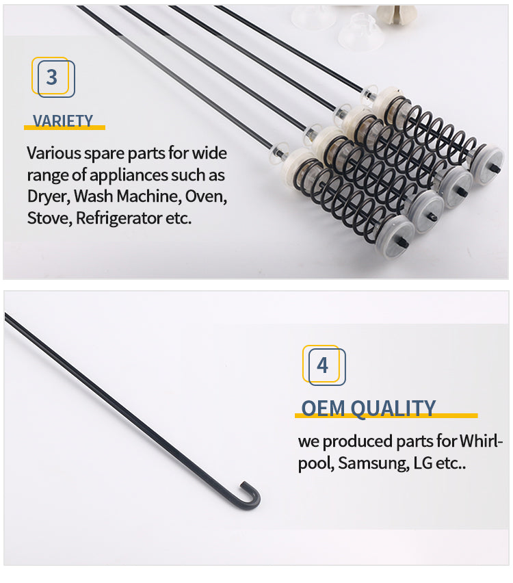 1.W10780045 Suspension Rod Assembly supports the washer tub to balance the washer in unbalanced conditions, acts as a shock absorber to reduce vibration to keep the washer stable.W10780045 Suspension Rod allows the washing machine tub to move to a certain extent, helping to minimize vibration in spin mode.These W10780045 rod/spring assemblies are approximately 26.34 inches in length.
