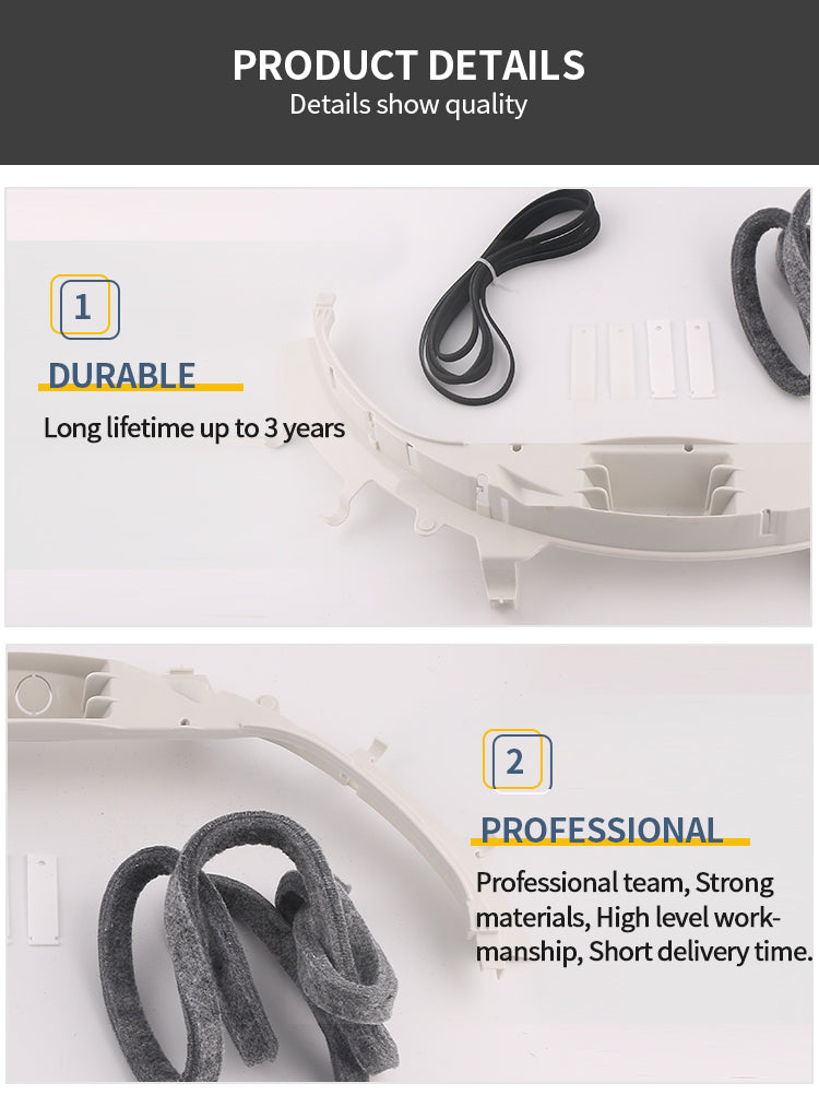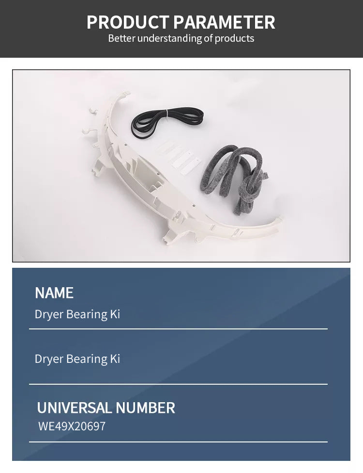 1.WE49X20697 Dryer Repair Kit Contains: 2xWEIM333 White Drum Slides ,2xWE1M1067 White Drum Slides, 1xWE09X20441 Drum Felt, 1xWE3M26 Top Bearing ,1x137292700 Drive Belt