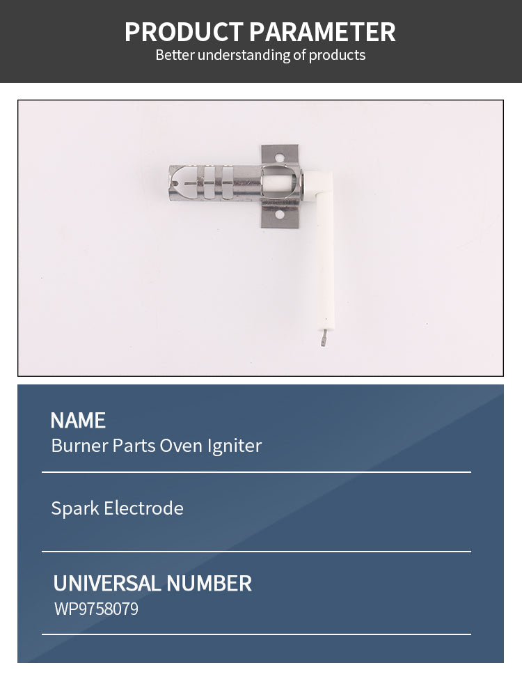 1.WP9758079 Bake Oven Spark Igniter is suitable for range and is a surface burner igniter.Gas stove oven with mounting bracket for baking spark igniter electrode. WP9758079 whirlpool oven igniter used to generate sparks or ignite the gas used to ignite oven burners or surface burners or some gas stove models with DSI (direct spark ignition) systems. 9758079 igniter is made of high quality materials, strong and durable.